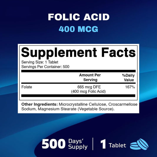 High-Quality Folic Acid (Vitamin B9) 400 Mcg Supplement - 500 Tablets - Non-GMO & Gluten Free - Made in USA by Amazing Nutrition