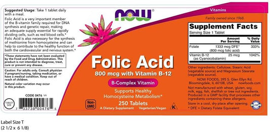 Pack of 2 NOW Foods Folic Acid 800 mcg Tablets for Daily Folate Supplementation