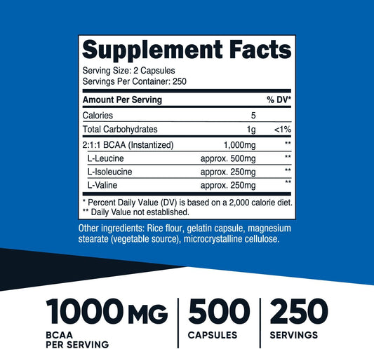 2 Bottles of Nutricost BCAA 1000mg, 500 Capsules - 2:1:1 Ratio of Leucine, Isoleucine, Valine - 250 ServingsVendor:NutricostRegular price $169.10 AUDRegular priceUnit price / per-