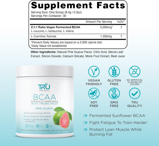 Plant-Based TRU BCAA Powder with Pink Guava Flavor - Vegan Friendly, Zero Calories, No Artificial Ingredients - 30 ServingsVendor:TRU SupplementsRegular price $169.18 AUDRegular priceUnit price / per-