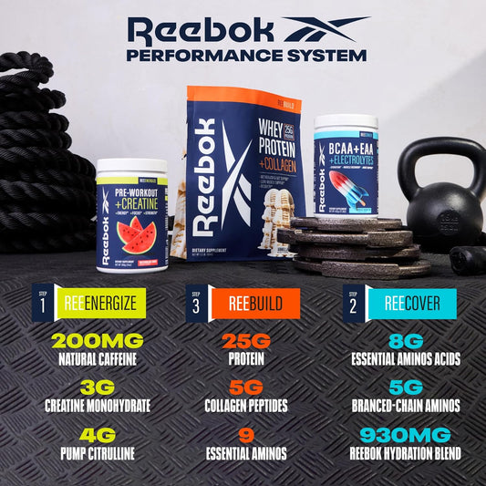 Reebok Complete Athletic Performance System with ReeEnergize Pre-Workout, ReeCover BCAA + EAA, ReeBuild Whey + CollagenVendor:ReebokRegular price $253.63 AUDRegular priceUnit price / per-