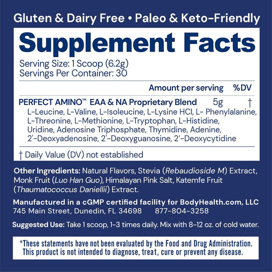 Vanilla BodyHealth PerfectAmino Powder: BCAA and EAA Energy Drink for Lean Muscle and Recovery - Pre and Post Workout Supplement for Men and Women - 30 Servings