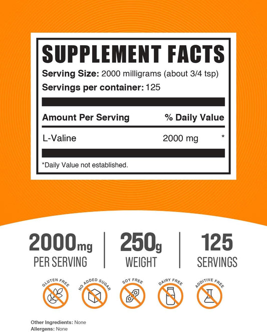 BulkSupplements L-Valine Powder - BCAA Amino Acid Supplement, 2000mg per Serving - Gluten-Free Valine Powder, 250g (8.8 oz)