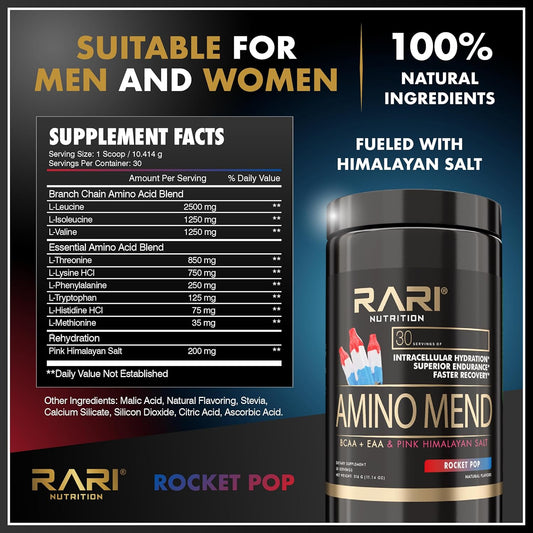 RARI Nutrition Amino Mend Recovery Drink - 5000mg BCAAs, 2085mg EAAs, 30 Servings, Rocket Pop Flavor