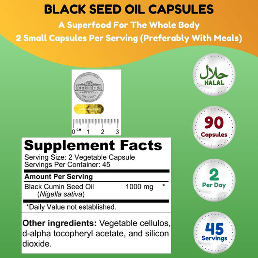 Premium Halal Black Seed Oil Capsules | 1000mg 45 Servings | Nigella Sativa, Kalonji | Supports Hair, Skin, Joints, Immune System, Heart Health, Digestion | Shifaa Nutrition