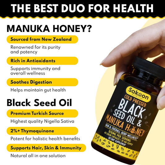 High Potency Cold Pressed Black Seed Oil Capsules with Manuka Honey - 60 Vegan Capsules - Made in USA - 2%+ ThymoquinoneVendor:Sakoon nutritionRegular price $131.95 AUDRegular priceUnit price / per-