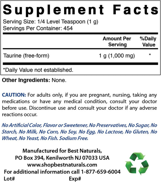 100% Pure Taurine Powder Free Form - 1000mg per Serving - 2 Lb (908 gm) - Best Naturals