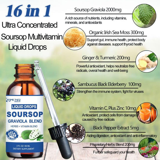 Organic Soursop Graviola Liquid Drops with Sea Moss and Grape Seed Extract for Skin and Immune Health - 2 Fl/Oz