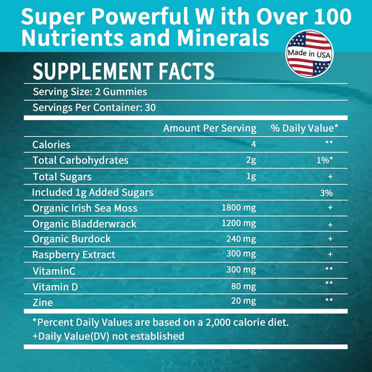 Organic Sea Moss Gummies with Bladderwrack for Immune Support - Vegan 60 Count - Thyroid Health - Vitamin C & D - Adults