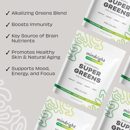Organic Mindright Super Greens Powder for Daily Wellness & Mental Clarity - Alkalizing Superfood Greens Blend - 30 Day Supply