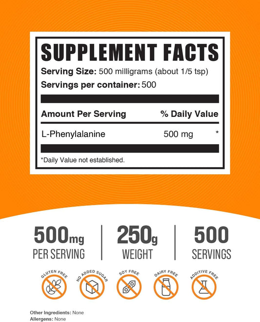 BulkSupplements.com L-Phenylalanine Powder - 500mg Amino Acid Supplement for Enhanced Health and Wellness - Gluten Free, 250g (8.8 oz) Pack of 1