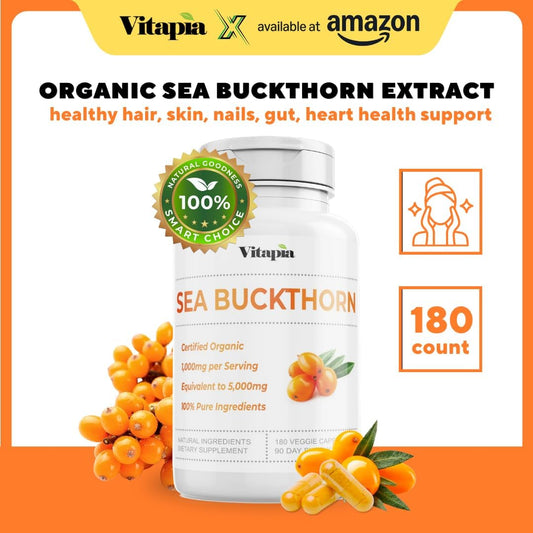 Organic Sea Buckthorn Extract Capsules for Heart Health, Skin, Immune Support - 5:1 Ratio - 180 Veggie Capsules - Omega 7, 3, 6, 9 - Non-GMO, Gluten-Free, Vegan