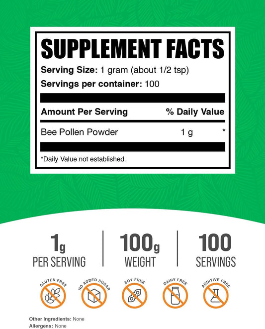 BulkSupplements.com Bee Pollen Powder - Immune Support Superfood Supplement, Natural & Gluten Free - 1000mg per Serving - 100g (3.5 oz) Pack of 1