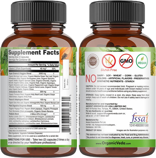 Organic Veda Superfoods Greens Capsules - Super Green Juice and Veggies Supplement with Moringa, Matcha, Spirulina, Chlorella, Turmeric - Antioxidants, Probiotics & Digestive Enzymes - 120 ct