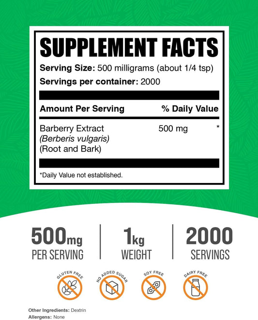 BulkSupplements.com Barberry Extract Powder - Herbal Supplement, Gluten Free, 500mg per Serving, 1kg (2.2 lbs) (Pack of 1) - Barberry Supplements