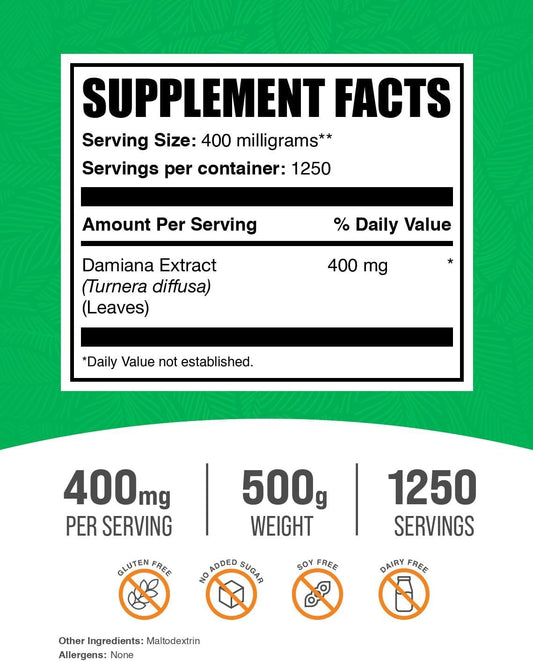 BulkSupplements.com Damiana Extract Powder - Herbal Supplement, 500g (1.1 lbs), Gluten Free - Damiana Leaf Extract, 400mg per Serving
