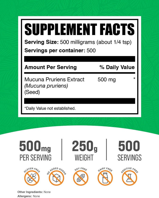 BulkSupplements.com Mucuna Pruriens Extract Powder - Vegan & Gluten Free Supplement, 500mg per Serving - 250g (8.8 oz)
