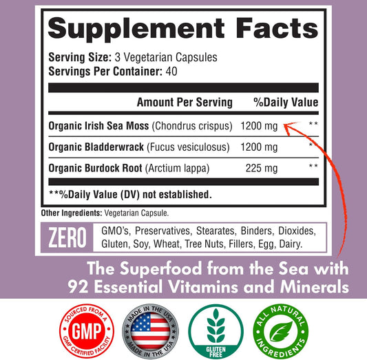 Organic Irish Seamoss Capsules with Bladderwrack & Burdock Root - 2625mg per Serving for Digestive & Immune Health
