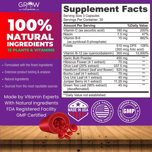 Blood Pressure Support Supplement with Garlic, Hawthorn & Hibiscus - 90 Capsules for Cardiovascular Health