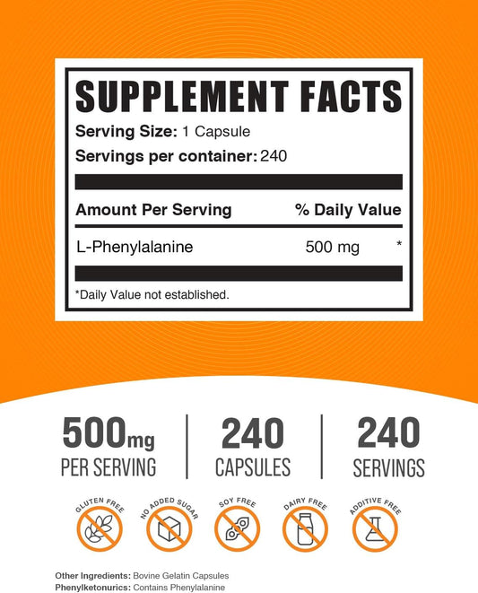 BulkSupplements.com L-Phenylalanine Capsules - 500mg Supplement, Gluten-Free, 240 Capsules - 1 Capsule/Serving
