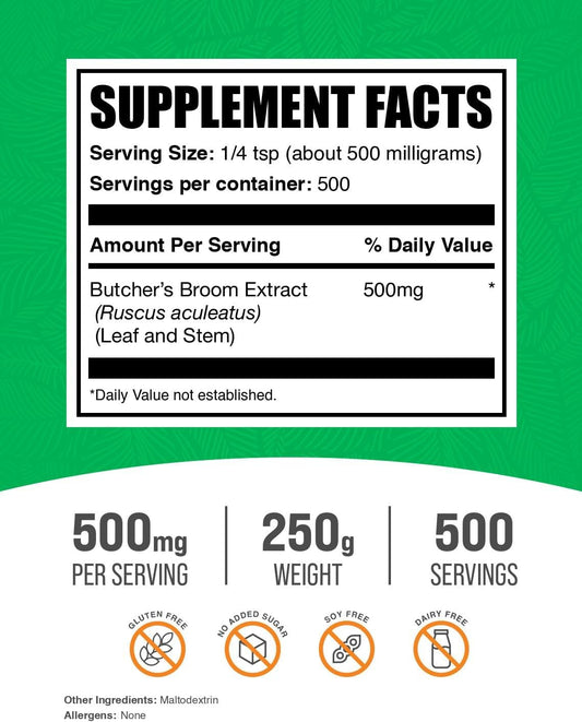 Butcher's Broom Extract Powder - 500mg Herbal Supplement, Gluten Free - 250g (8.8 oz) Pack of 1