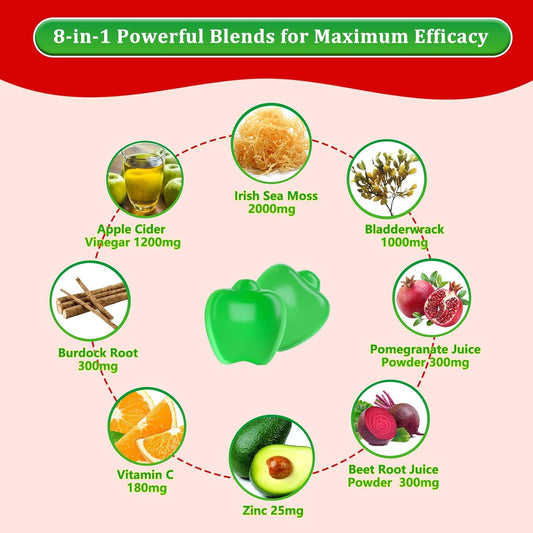 Apple Flavored Vazatisi Vegan Sea Moss Gummies with ACV, Pomegranate, Beet Root, Bladderwrack, Burdock, Vitamin C, and Zinc for Digestion, Mood, Energy, and Immune Support