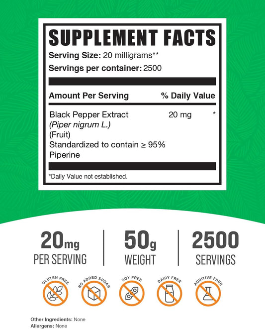 High Quality Black Pepper Extract Powder with 95% Piperine - Piperine Supplements - 20mg per Serving - 50g (1.8 oz) Pack