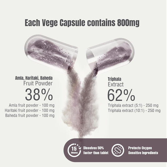 Herbsforever Triphala Capsules Extract 8:1 Ratio - 40% Amla, Haritaki & Bibhitaki - Daily Detox, Cleanse & Rejuvenate - 60 Veg Caps