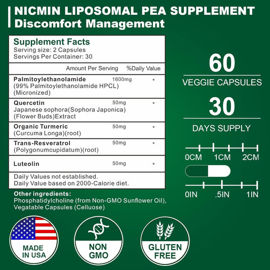 High Absorption NICMIN 1600MG Palmitoylethanolamide 99% with Luteolin & Quercetin Supplement - 60 Capsules