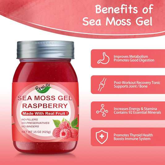 Organic Raspberry Sea Moss Gel 15oz - Rich in Irish Sea Moss - Antioxidant Health Supplement - Vegan-Friendly