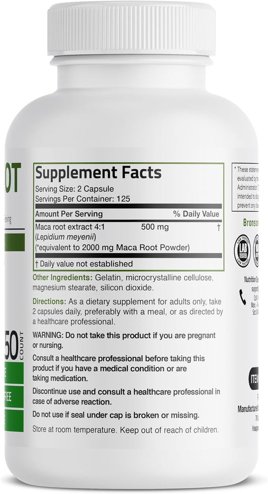250 Non-GMO Vegetarian Capsules of Bronson Maca Root Extract from Lepidium Meyenii