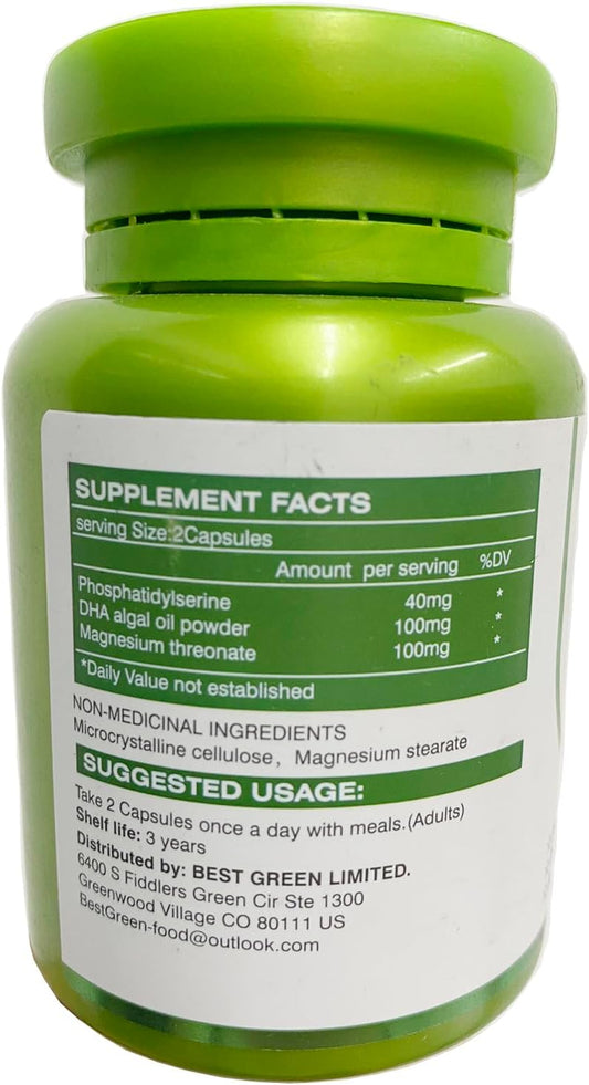 Magnesium L-threonate Complex with DHA and Phosphatidylserine - Brain Health Support for Elderly and Kids - 60 Capsules