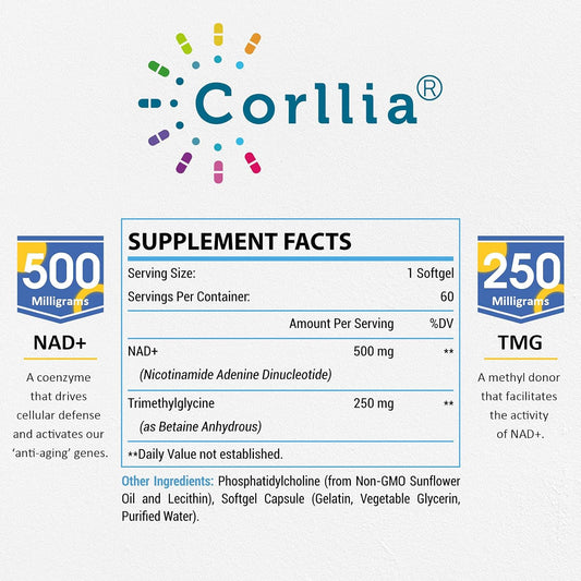 Corllia Liposomal NAD+ Softgels with TMG, 500mg NAD+ & 250mg TMG, 240 Servings, Nicotinamide Riboside Alternative