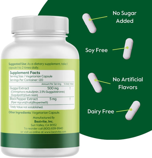 Premium Guggul Extract 500mg Capsules - Clinically Proven, Patented & Standardized Formula with Bioperine - Vegan, Non-GMO, Gluten-Free - 120 Vegetarian Capsules