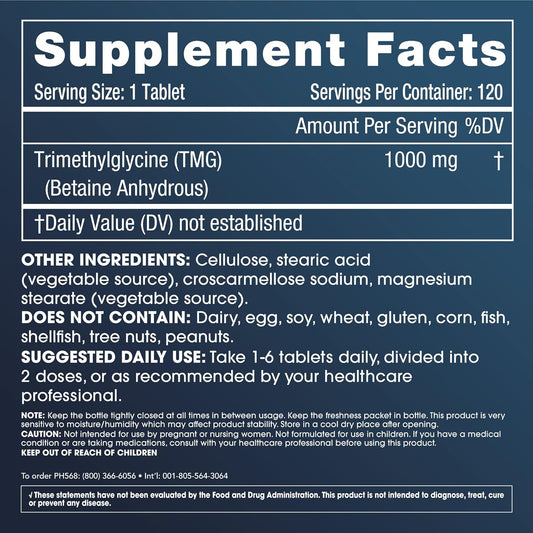 ProHealth Longevity TMG Supplements - Betaine Anhydrous Tablets 1,000mg for Methylation Support - 120 Count Pack