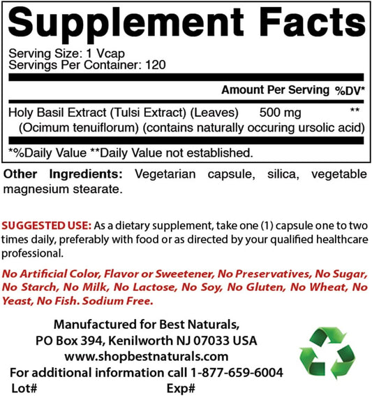 Organic Holy Basil Stress Relief Capsules - 500 mg, 120 Veggie Caps - Natural Anxiety & Mood Support