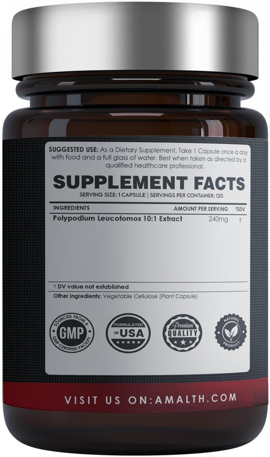 AMALTH Polypodium Leucotomos Extract Capsules - Antioxidant Supplement for Healthy Skin - 120 Count (Non-GMO, Gluten Free)