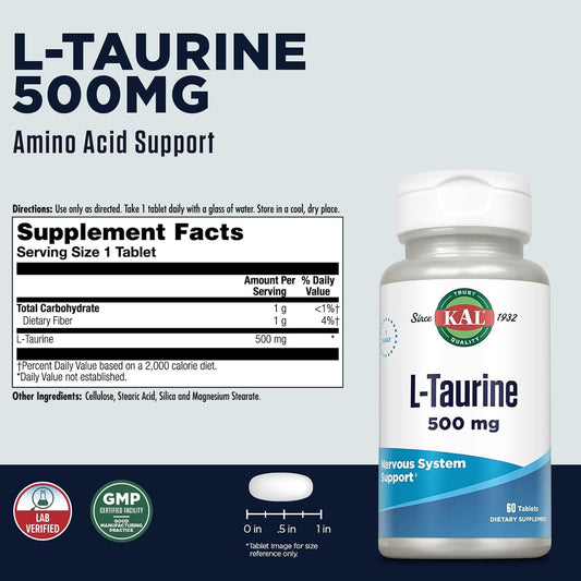 Taurine 500mg Amino Acid Supplement for Nervous System & Heart Health, Detox Support, Pre Workout - 60 Tablets