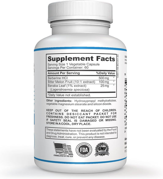Berberine Complex HCL 500mg Capsules with Melon Fruit & Banaba Leaf - Non-GMO Heart, Cognitive & GI Health Supplement - Made in USA - 60 Count