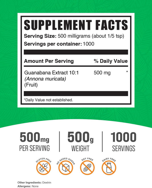 Organic Guanabana Fruit Extract Powder - Soursop Herbal Supplement, Gluten-Free, 500mg per Serving - 500g (1.1 lbs) Pack of 1 by BulkSupplements
