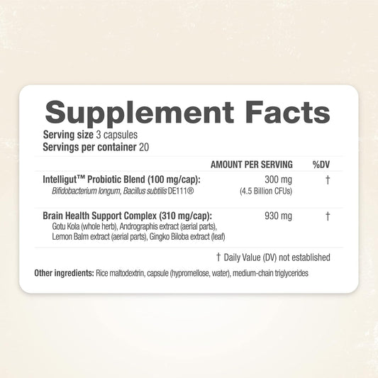 RidgeCrest Herbals Intelligut: Memory and Focus Supplement with Ginkgo Biloba, Lemon Balm Extract, Probiotics - 60 Vegan Capsules