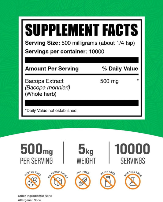 BulkSupplements.com Bacopa Monnieri Extract Powder - Vegan Gluten Free Supplement, 500mg per Serving - 5kg (11 lbs) Pack of 5