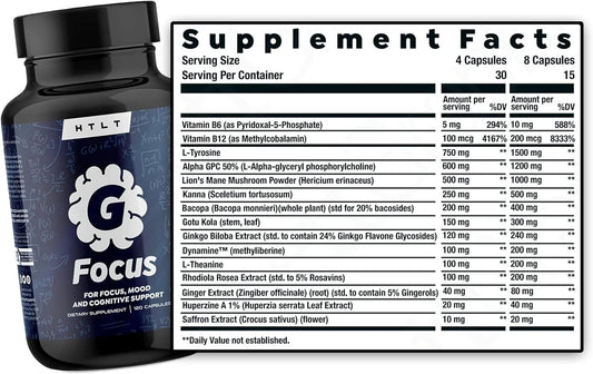 HTLT Supps G Focus Capsules | Cognitive Support & Mood Enhancement | Alpha GPC, Rhodiola Rosea, Lion’s Mane, Gotu Kola, Ginkgo Biloba, Huperzine A | 120 Count