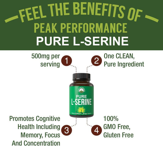 USA Grade L-Serine Capsules 500mg - Best Brain & Nootropic Amino Acids - Non-GMO Supplement - 60 Servings