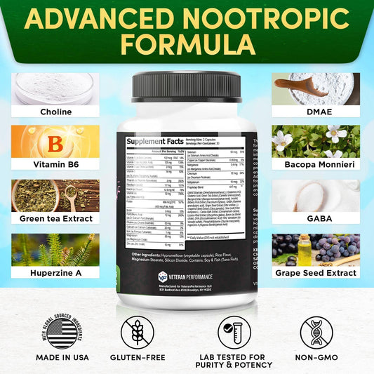 Veteran Performance Alpha Alert Brain Supplement - Memory & Focus Nootropic with DMAE, Choline, GABA, Vitamin B6 - Cognitive Function Booster (60 Count)