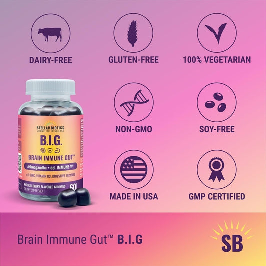 All Natural Del-Immune V + Ashwagandha Brain Immune Gut Gummies - Immune & Gut Support with Zinc, Vitamin D3, and Digestive Enzymes (60 Count)