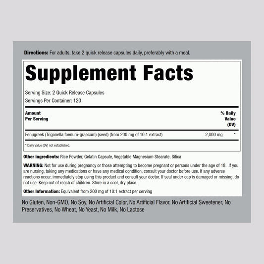 2000mg Fenugreek Seed Extract Capsules | 240 Pills | Non GMO, Gluten Free Supplement for Women & Men by Piping Rock