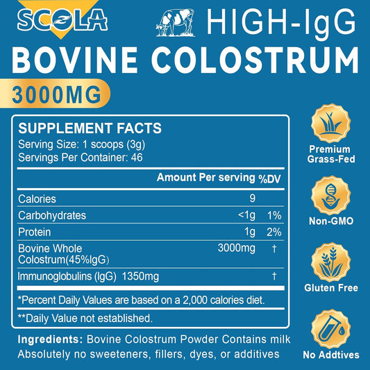 High IgG Bovine Colostrum Powder Supplement - Gut Health, Immune Support, Beauty Boost - Grass-Fed, Non-GMO - 3000mg/Serving, 4.9 oz - 46 Servings