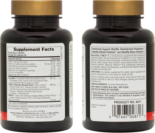 Natures Plus T Male Vegetarian Capsules - Promotes Muscle Gain, Stamina, & Mood - Gluten-Free - 30 Servings