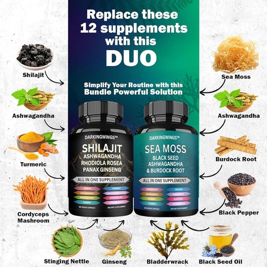 Ultimate Sea Moss and Shilajit Supplement Bundle with Black Seed Oil, Ashwagandha, Rhodiola Rosea, Panax Ginseng - 9000mg Shilajit, 3000mg Sea Moss